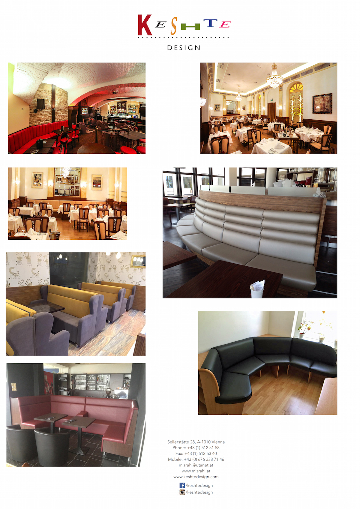 Polsterungs- und Tapezierarbeiten Gastronomie und HotelbetriebenMit unserer mehr als 20-jaehriger Textilhandel-Erfahrung haben wir ein neues Moebellabel „KESHTE DESIGN“ gegruendet und seit Juni 2012 sind wir mit unseren Kollektionen erfolgreich auf dem Markt. Wir fuehren diverse Moebelkollektionen und bieten unseren Kunden auch Polsterungarbeiten an. Neben zahlreichen Privatkunden werden unsere Dienste auch von Gastronomie und Hotelbetrieben in Anspruch genommen.